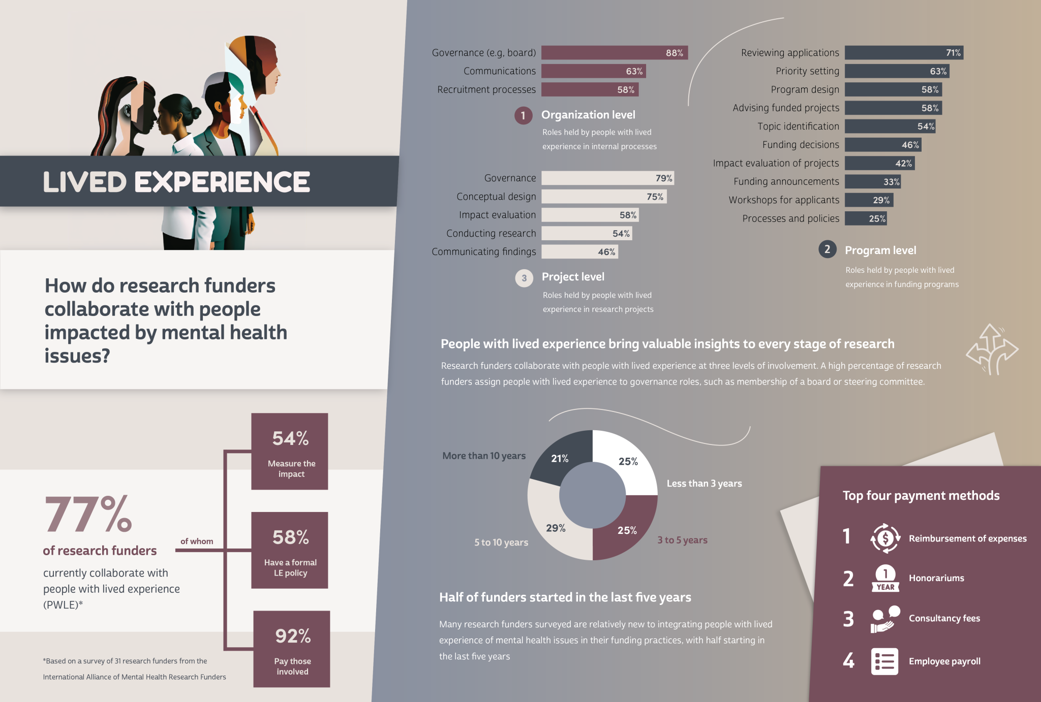 In March 2023, the IAMHRF revealed the results of its survey of how funders collaborate with people with lived experience of mental health issues. Promisingly, the number of funders involving PWLE has doubled in the last five years – but there is no room for complacency. Want to find out more? We’ve summarized the results in a handy infographic below. The full results were published in Nature Mental Health and are available to read for free. In the meantime, explore the reaction to the findings in these two videos, featuring Vanessa Pinfold of the McPin Foundation and Monique van den Eiljden of MIND/ZonMw