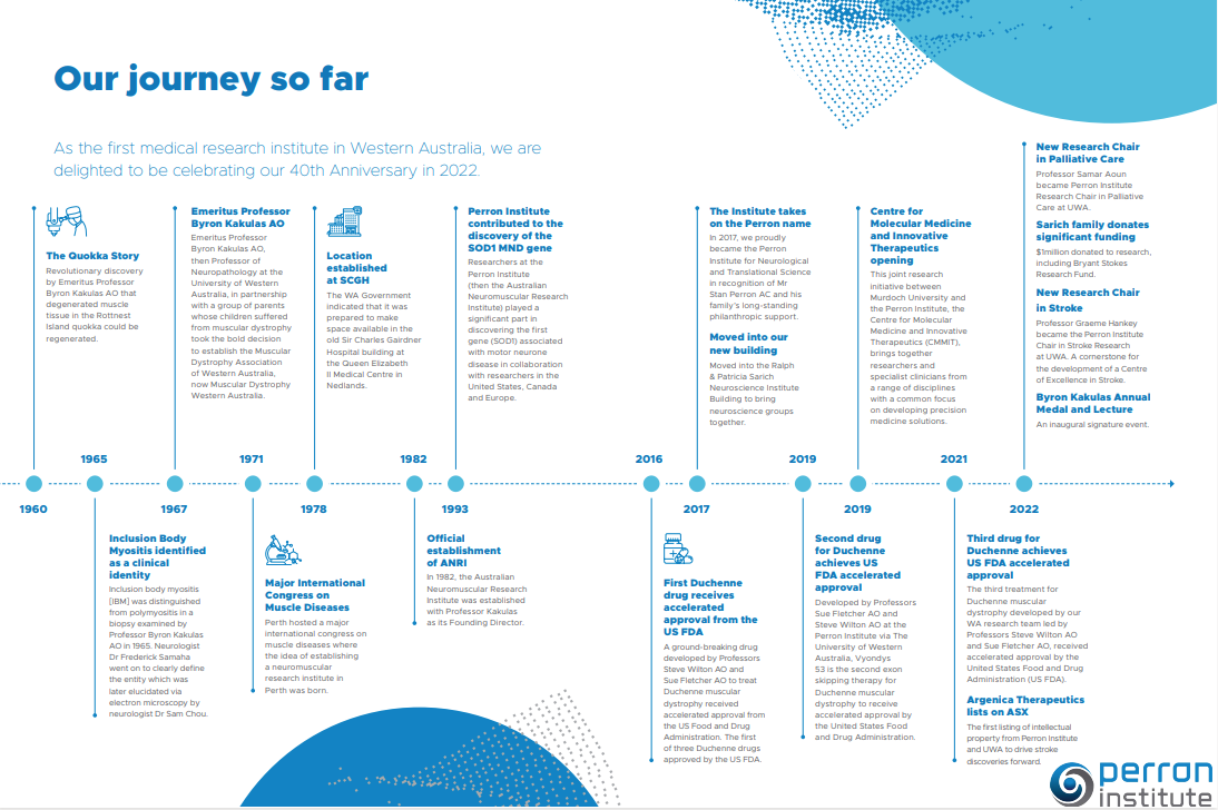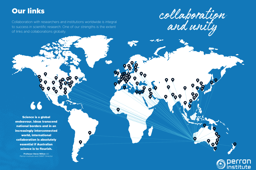 Since its inception, the Perron Institute for Neurological and Translational Science has built an international reputation as an innovative and collaborative centre of excellence for medical research. Transforming results from the lab into community benefit through discoveries and treatments is what we set out to achieve. We are mindful that many people around the world are suffering from diseases and disorders that as yet have no effective treatments, and hoping and waiting for research outcomes to become available. Our scientists and clinicians are working with experts in their fields and people with lived experience to create the future of personalised, precision medicine by tackling global health challenges and tailoring therapies to specific groups and individuals. Our goal is to continue to build on our research and develop collaborations that generate and efficiently translate research evidence for health benefit.